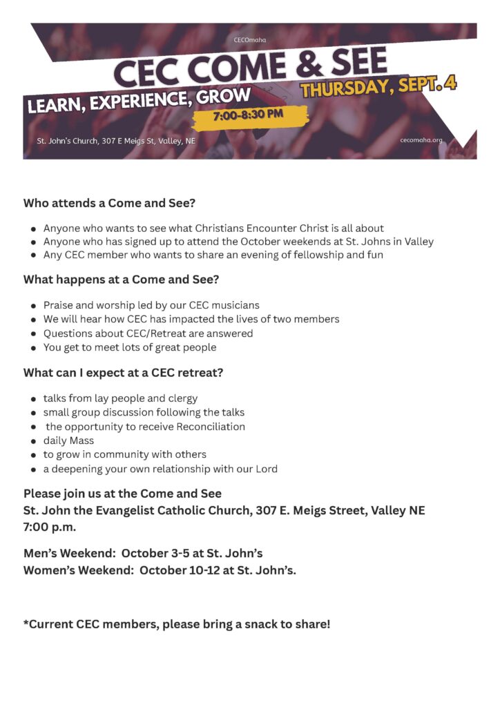 Join the Omaha area CEC (Christians Encounter Christ) Community at 7 pm. Thursday September 4th in the social hall. The evening will include an explanation of CEC, a witness, songs, and refreshments/snacks. If you are curious about CEC – come and see. If you are a current CEC’r, join other CEC’rs and bring a friend.
