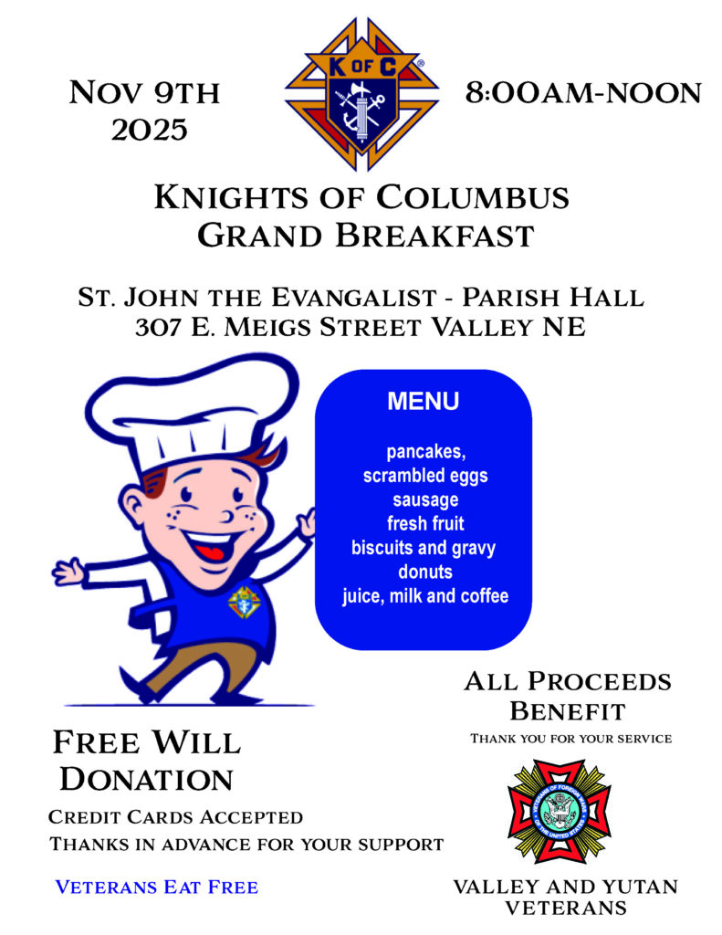 Knights of Columbus Grand Breakfast from 8am-Noon In the Parish Hall for pancakes, scrambled eggs, sausage, donuts, biscuit & gravy & fresh fruit, coffee, milk & juice All proceeds will benefit: Veterans Free Will Donation (can accept cards)
